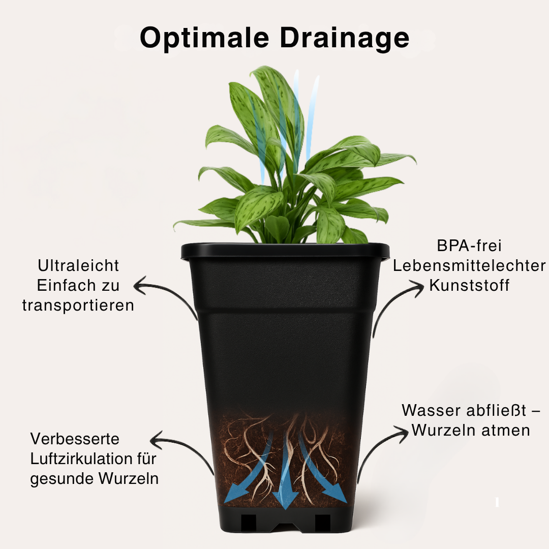 Der Air-Pruning-Effekt entsteht, wenn Wurzelspitzen in einem belüfteten Topf auf Luft treffen, austrocknen und sich dadurch von selbst „abschneiden“. Die Pflanze reagiert mit vielen neuen Seitenwurzeln, was die Wasser- und Nährstoffaufnahme deutlich erhöht und Staunässe sowie Wurzelfäule vorbeugt.